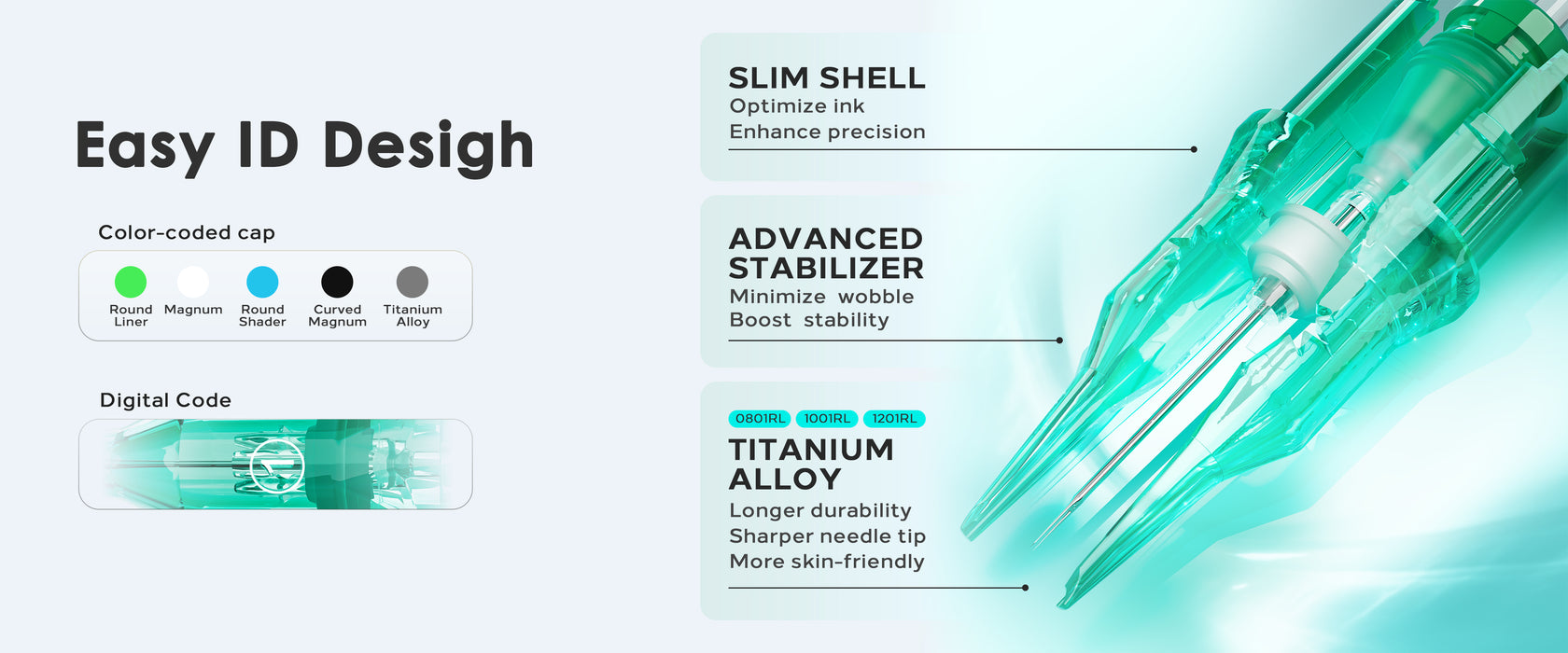 NEEDLE MATERIAL: Crafted from 316L stainless steel (titanium alloy in select variants, more ideal for sensitive skin), ensuring smooth ink flow and lasting durability for steady, reliable tattooing performance.